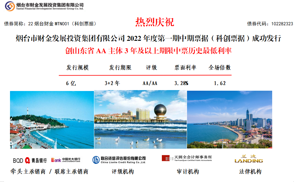 10月20日,集團2022年度首期中期票據(jù)(科創(chuàng)票據(jù))成功發(fā)行!發(fā)行規(guī)模6億元,期限3+2年,票面利率3.28%,全場認購倍數(shù)1.62倍,創(chuàng)山東省AA主體3年及以上期限中票歷史最低利率,同時也是山東省首筆基金類科創(chuàng)票據(jù),煙臺市首筆用途類科創(chuàng)票據(jù)。本期債券發(fā)行由青島銀行牽頭主承,光大銀行聯(lián)席主承,聯(lián)合資信、天圓全會計師事務所及蘭迪律師事務所分別提供信用評級、審計和法律服務。